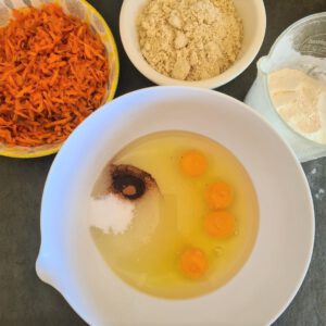 Zunächst habe ich die Karotten gewaschen, geschält und klein gerieben. Dann habe ich den Zucker, Zimt, die Eier und das Öl in einer Schüssel mit dem Rührgerät zu einem glatten Teig verrührt. Schließlich habe ich nach und nach die Karotten, Mandeln und das Mehl (vermischt mit dem Backpulver) hinzugegeben und alles miteinander verrührt.