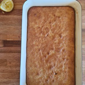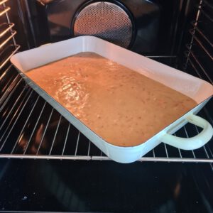 Dann habe ich den Teig in eine eingefettete Form gegeben und ca. 40 Minuten gebacken. Mit einem Holzstäbchen kann man testen, ob der Teig innen noch flüssig ist – reinstecken, und wenn kein Teig hängen bleibt, ist er fertig gebacken!