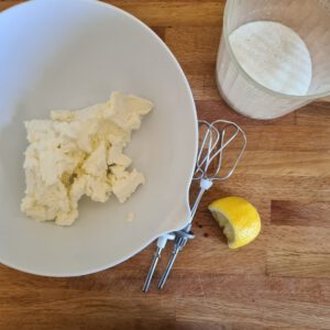 Für das Frosting habe ich den Frischkäse mit dem Zitronensaft in einer Schüssel verrührt und nach und nach den Puderzucker mit dem Vanillezucker hinzugegeben.
